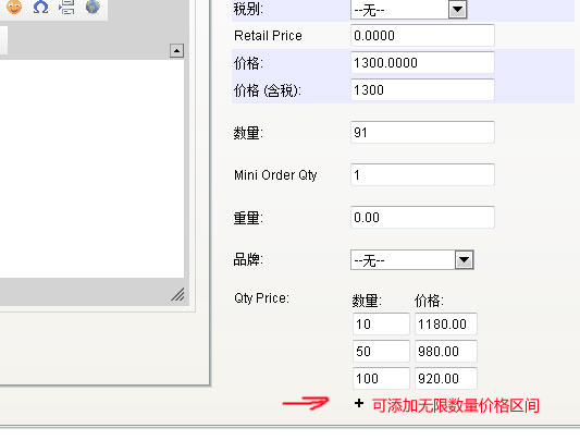 该模块为自主开发,可为每件商品 设置不同的数量区间和价格。后台采用AJAX 表单,可无限设置不同的数量和价格.轻松添加页面不会刷新, 后台设置数量价格前台即显示数量价格列表。 不设置即按普通商品价格,非常方便。